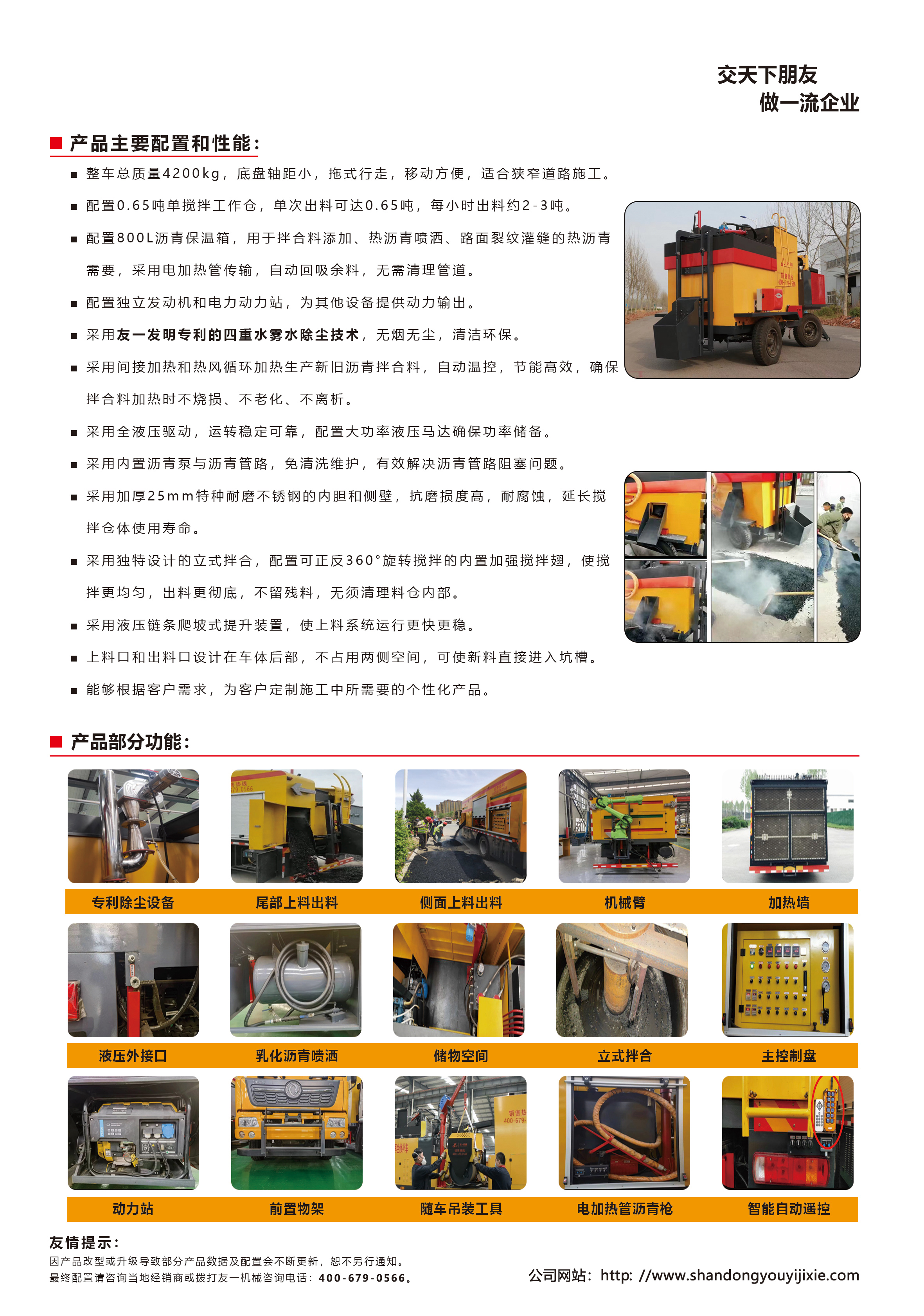 山東友一機(jī)械設(shè)備有限公司主要生產(chǎn)路面綜合養(yǎng)護(hù)車、瀝青路面養(yǎng)護(hù)車、道路養(yǎng)護(hù)車、瀝青熱再生修補車、瀝青灌縫機(jī),專注、專業(yè)于道路養(yǎng)護(hù)機(jī)械設(shè)備與養(yǎng)護(hù)材料的生產(chǎn)和研發(fā)。